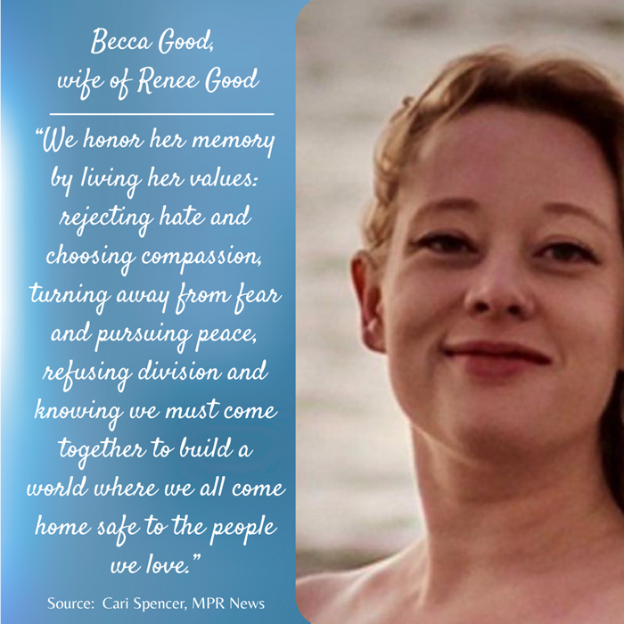 Like a large part of the world, I watched in horror as a young mother/wife/daughter was shot and killed on a quiet residential street in south Minneapolis, Minnesota. Renee Nicole Good was in her SUV with her wife, Becca Good, who shared the following.