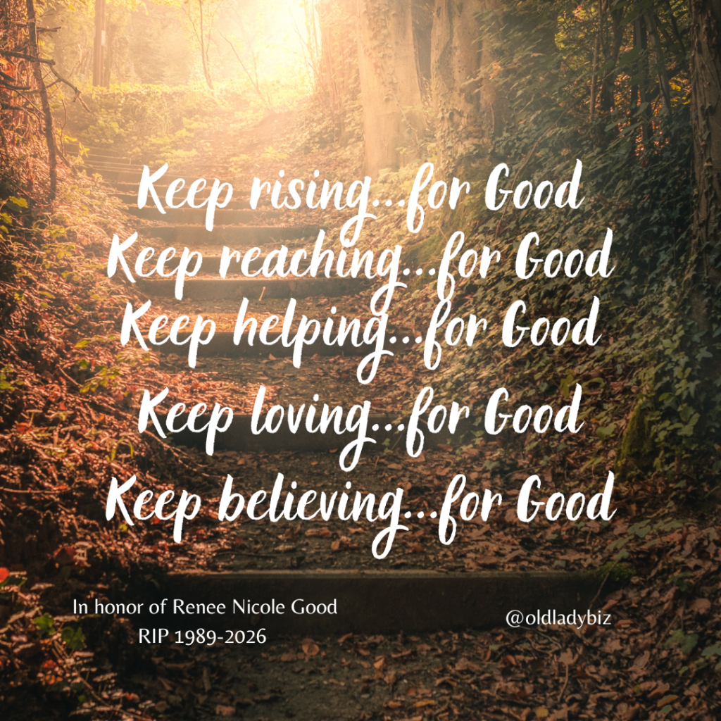 So at a time I look at the year’s goals, I remember Renee. We move forward when we remember what we value. We choose to be better. We select a better path. Rest in peace, Renee Nicole Good. We will not forget you.